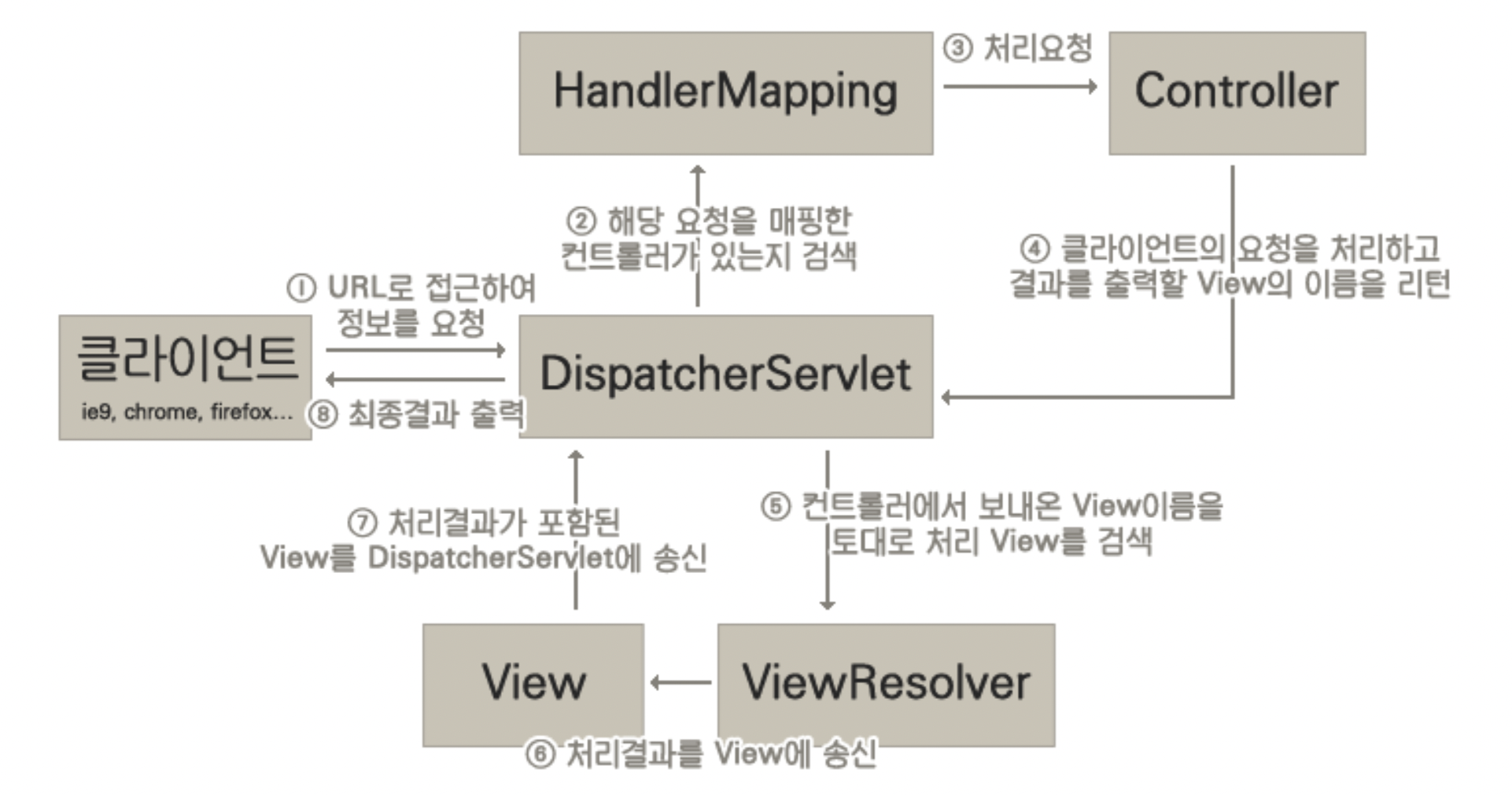 1) 클라이언트에서 요청이 오면 DispatcherServlet이 해당 요청을 받는다.