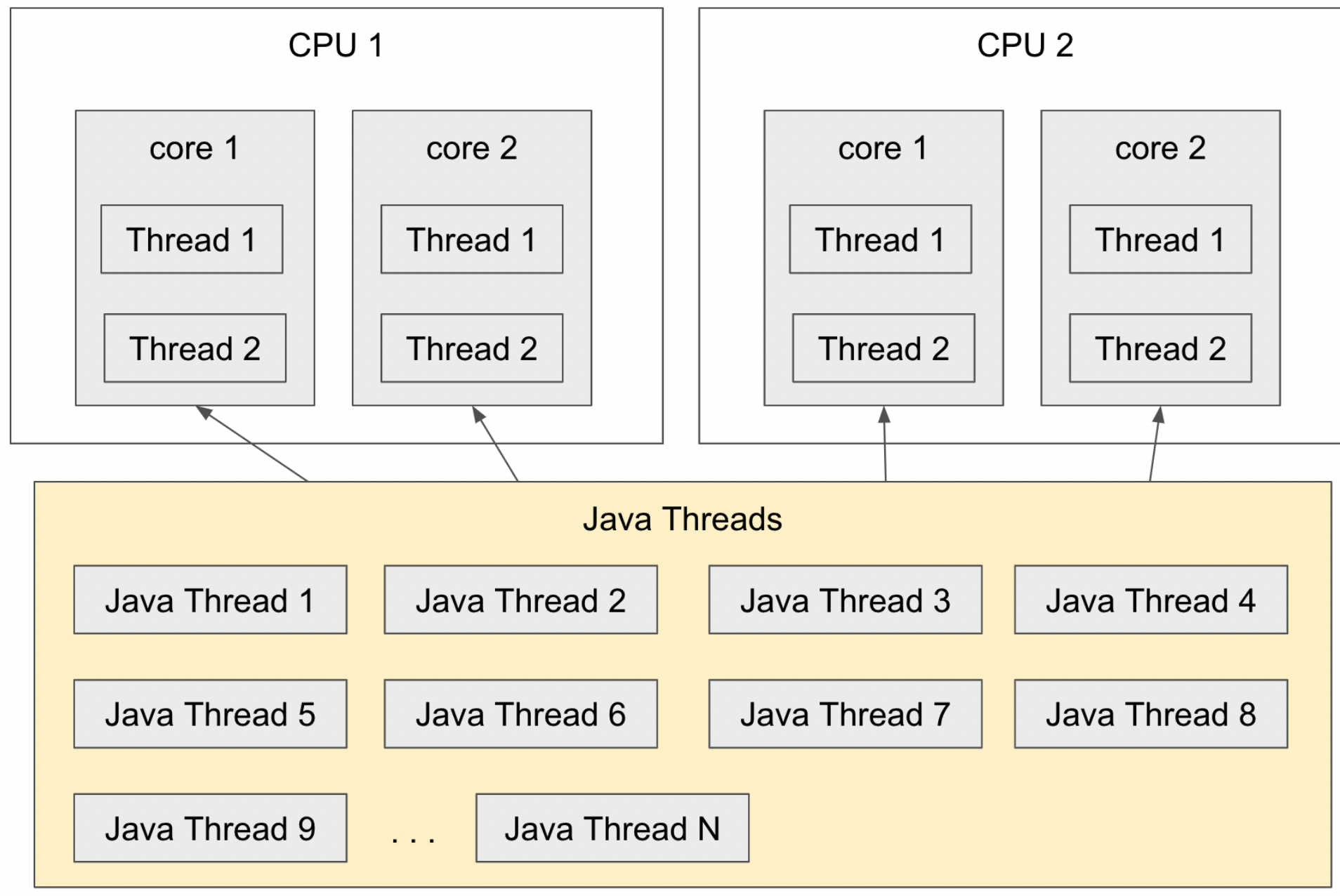 위 그림에서는 무수히 많은 논리적인 스레드가 4개의 물리적인 스레드를 아주 빠른 속도로 번갈아가며 사용하면서 마치 동시에 실행되는 것처럼 보이는 동시성을 갖는다. 물리적인 스레드의 총 개수보다 더 많은 논리적인 스레드가 동시에 실행되는 것이 아니라, 어느 짧은 순간에 최대한 많이 실행된다 하더라도 물리적인 스레드의 개수 내에서 실행된다는 의미다.