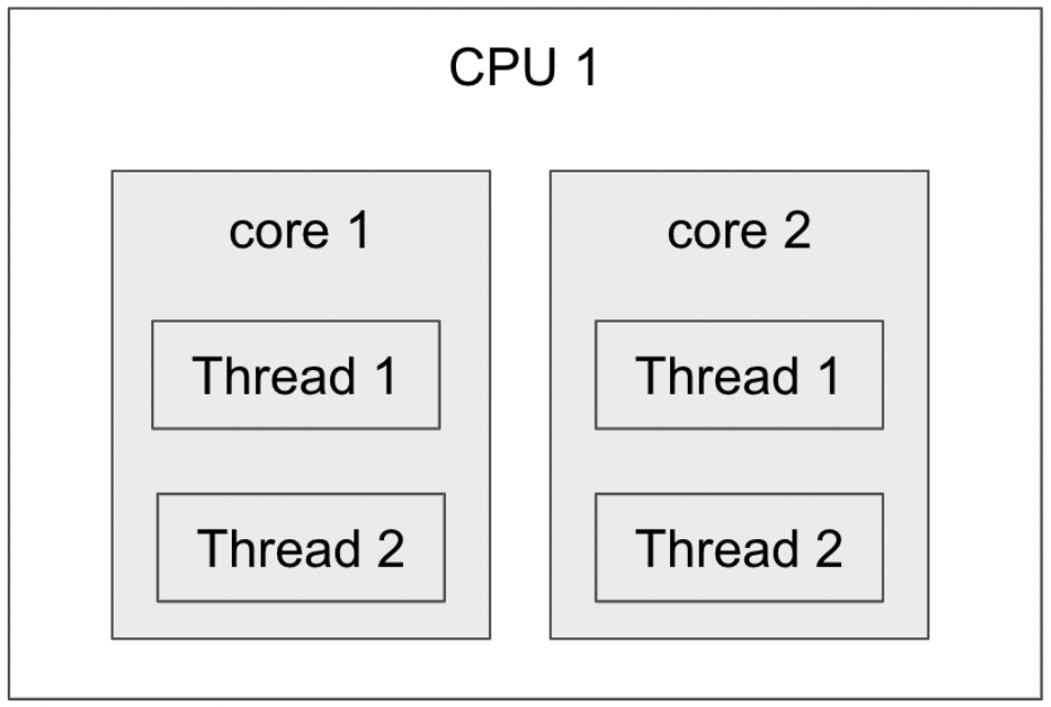 하나의 코어는 두개의 스레드를 포함하고 있는데 이 두개의 스레드는 물리적인 코어를 논리적으로 나눈 것을 의미한다. 이렇게 물리적인 코어를 논리적으로 나눈 코어를 물리적인 스레드라고 한다.