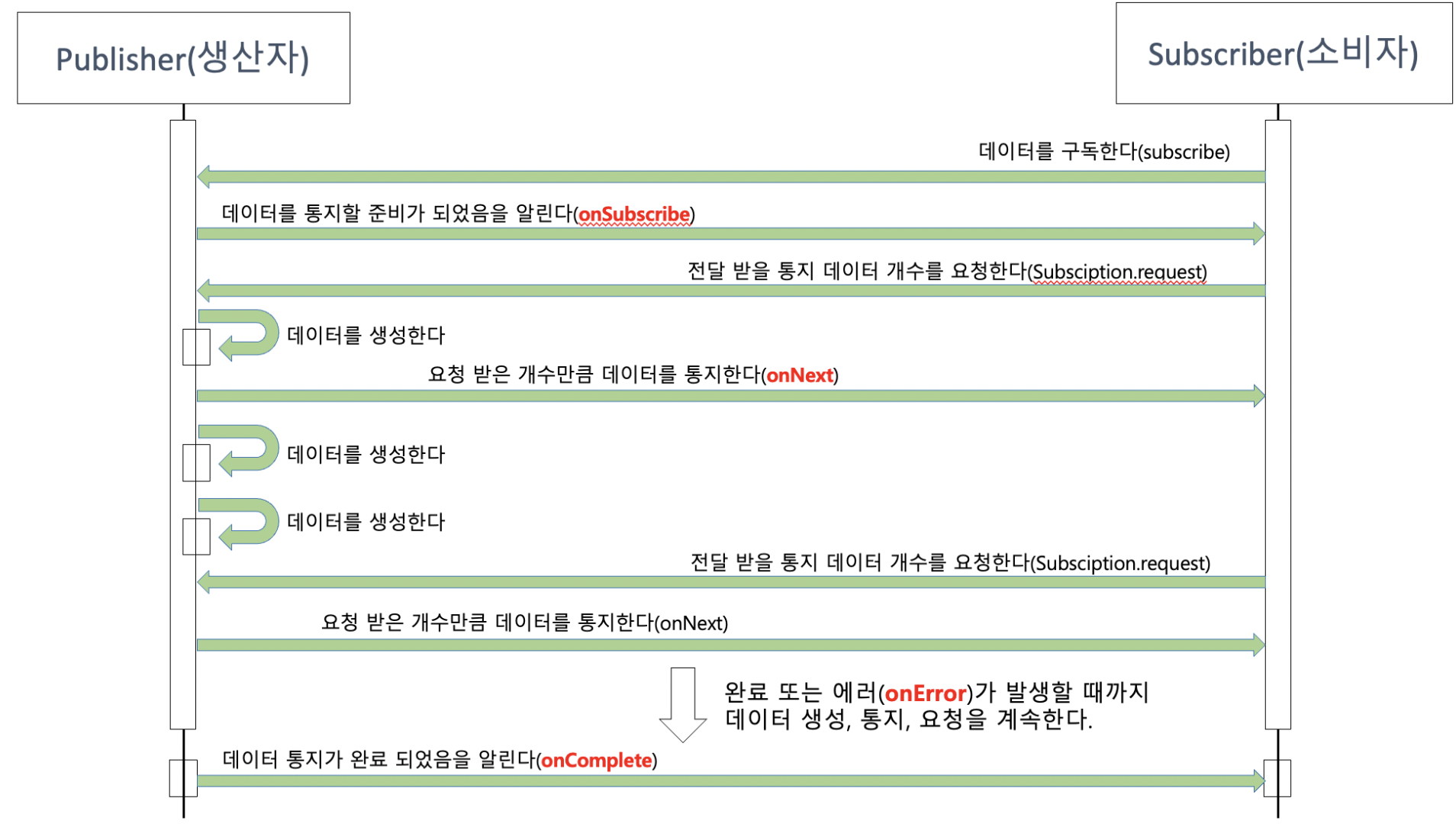 | 4 | Publisher는 Subscriber로부터 전달받은 요청 개수만큼의 데이터를 onNext() 메서드를 호출해서 Subsriber에게 전달한다. |