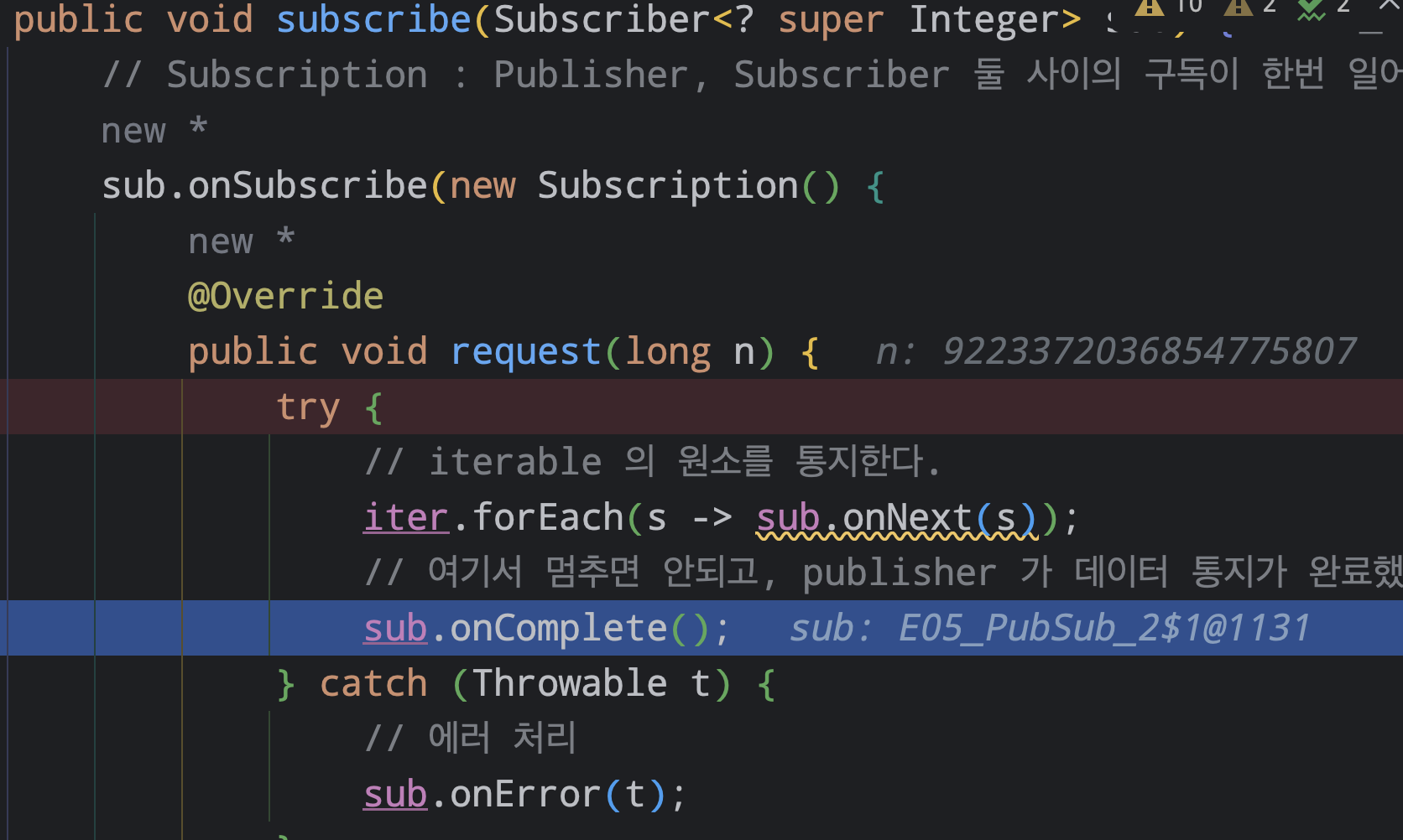 반복하다가 Publisher가 모든 데이터를 통지하게 되면 마지막으로 데이터 전송이 완료되었음을 Subscriber에게 알린다. 만약에 Publisher가 데이터를 처리하는 과정에서 에러가 발생하면 에러가 발생했음을 Subscriber에게 알린다.