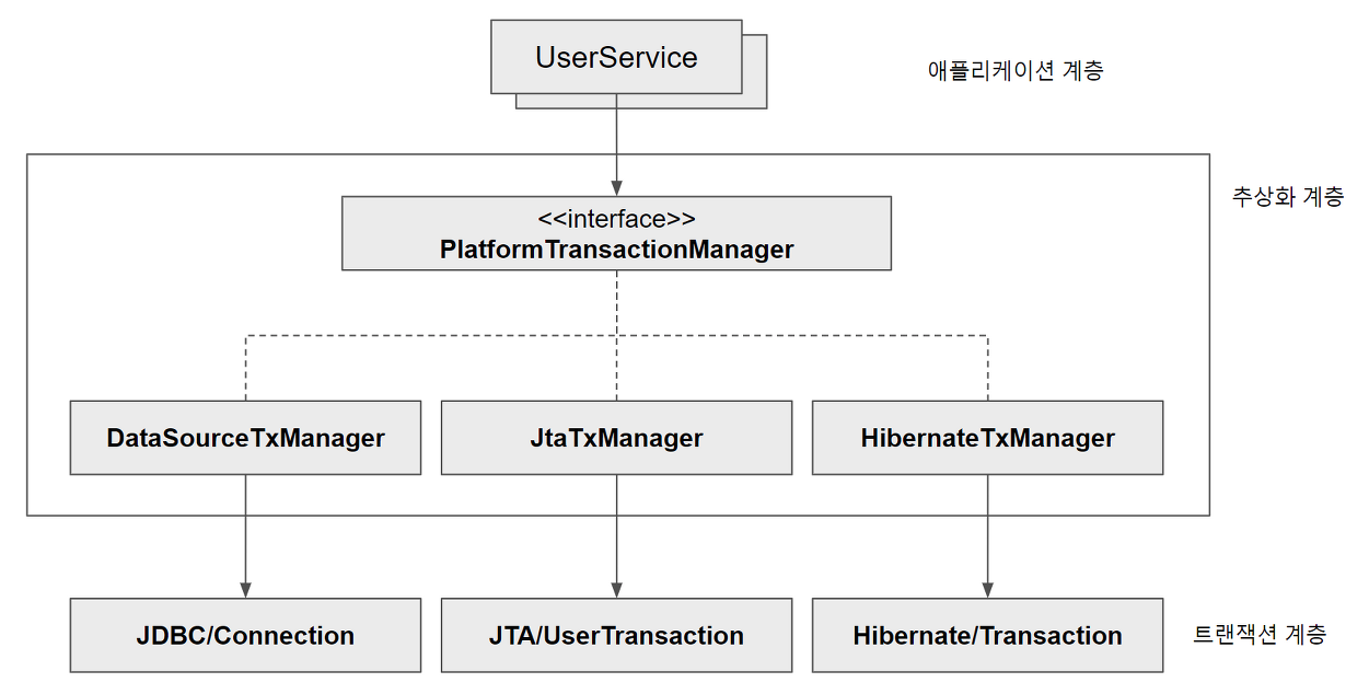 PlatformTransactionManager는 트랜잭션 관리의 구현 방식을 추상화하기 위한 인터페이스이기 때문에 개발자는 서로 다른 종류의 트랜잭션을 사용하더라도 각각의 차이점을 의식할 필요 없이 같은 API로 조작할 수 있다.
