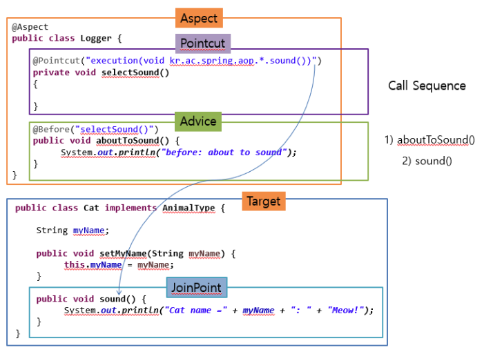 | PointCut | advice가 적용될 위치를 선별하는 기능을 말한다. (적용할 타겟의 메서드를 선별하는 정규표현식) |
