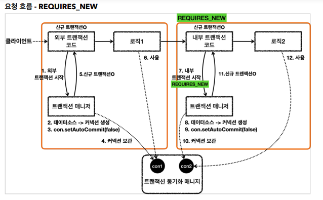 | @Transactional(value = "tx2", propagation = Propagation.REQUIRESNEW) | "tx2" 트랜잭션 관리자를, 전파 방식을 REQUIRES_NEW로 사용한다. |