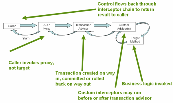2) AOP proxy에서 Transaction Advisor가 commit 또는 rollback 등의 트랜잭션 처리를 한다.