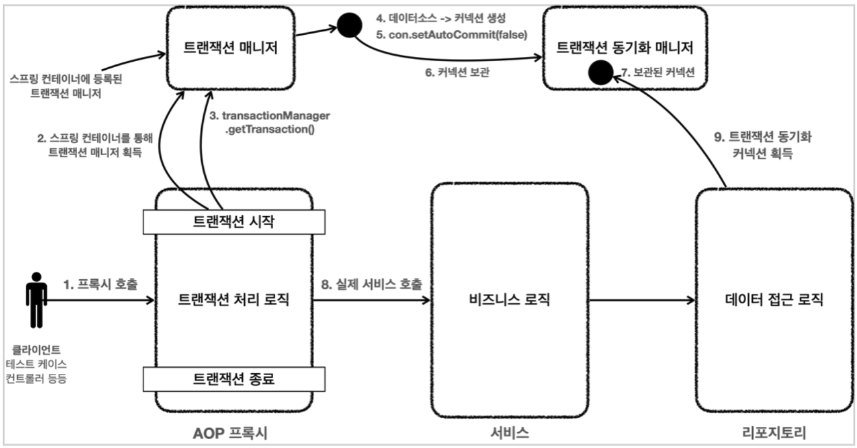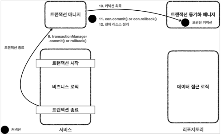 9. 비지니스 로직이 끝나고 transactionManager.commit() 혹은 rollback()으로 트랜잭션 종료