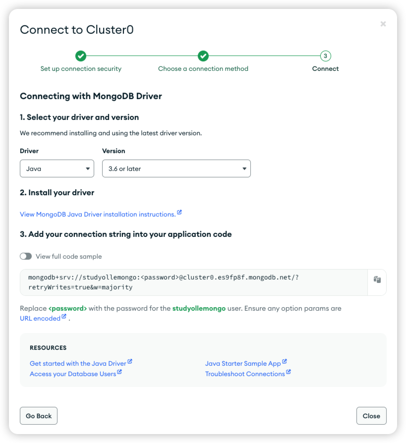 uri: mongodb+srv://studyollemongo:<password>@cluster0.es9fp8f.mongodb.net/studyolle?retryWrites=true&w=majority